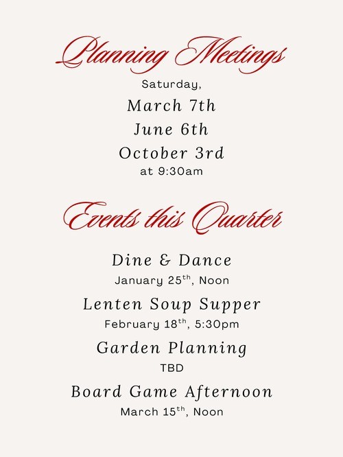 Each meeting will include an opening devotion by Pastor or an Elder, one of the below activities, and may be followed by a short business meeting.